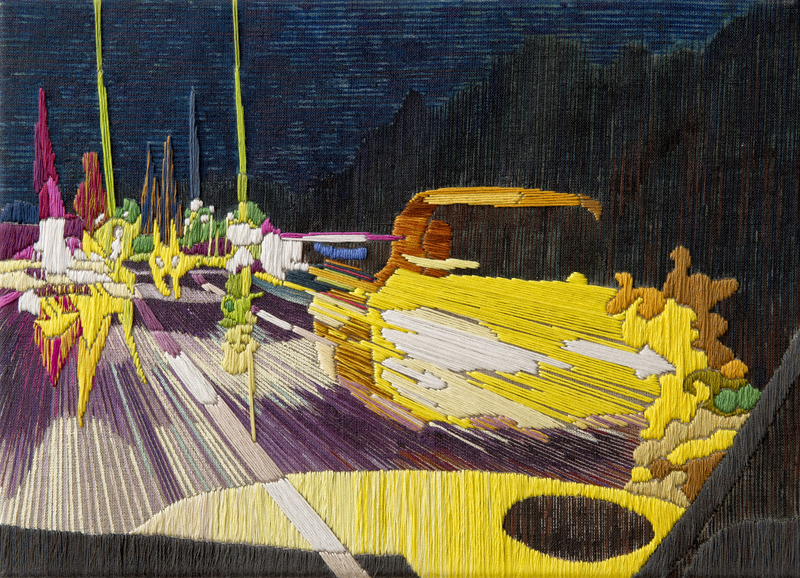In haar textiele schilderijen verbeeldt Pauline Nijenhuis ‘snelheid' in een zeer arbeidsintensieve en tijdrovende techniek (acrylverf en borduren met de hand). Op deze manier zoekt zij de vertraging op. Misschien onbewust een stil protest tegen de duizelingwekkende versnelling van onze maatschappij?